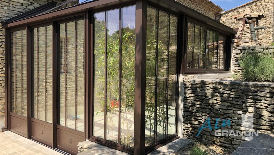 Véranda Jade, avec chassis coulissants et fixes type atelier